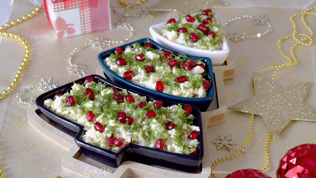 Салат выложить в салатник, посыпать сверху зеленью и зернами граната. Приятного аппетита!