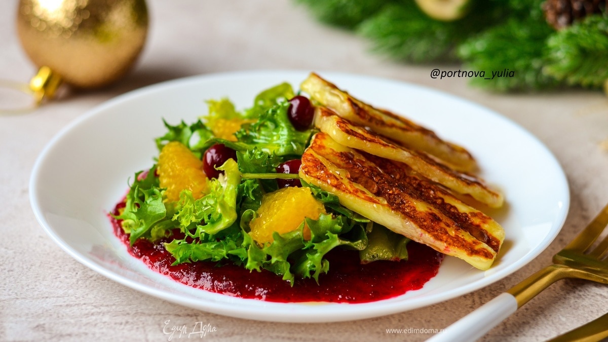 Халуми нарезаем ломтиками и обжариваем на гриле или сухой сковороде. - Шаг 2