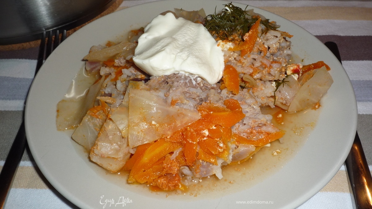 Ленивые голубцы — отличное решение для быстрого и сытного ужина. Тушение делает фарш и овощи нежными, а рис добавляет блюду сытности. Подавайте ленивые голубцы со сметаной и свежей зеленью — так вкус станет ещё более гармоничным. Это блюдо прекрасно подойдёт для семейного обеда или ужина, а благодаря простоте приготовления станет настоящим спасением в будни.Ингредиенты на Ингредиенты на порциипорции