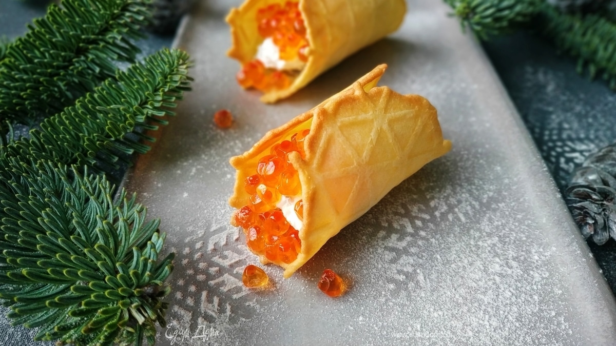 Хрустящие и в меру сладкие вафли хорошо сочетаются с солено-пряной начинкой. Добавьте по вкусу икру или малосольную красную рыбу.