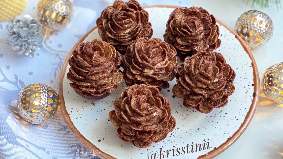 Шоколадными хлопьями дополнить образ шишки. Начинать сверху, постепенно спускаясь вниз.