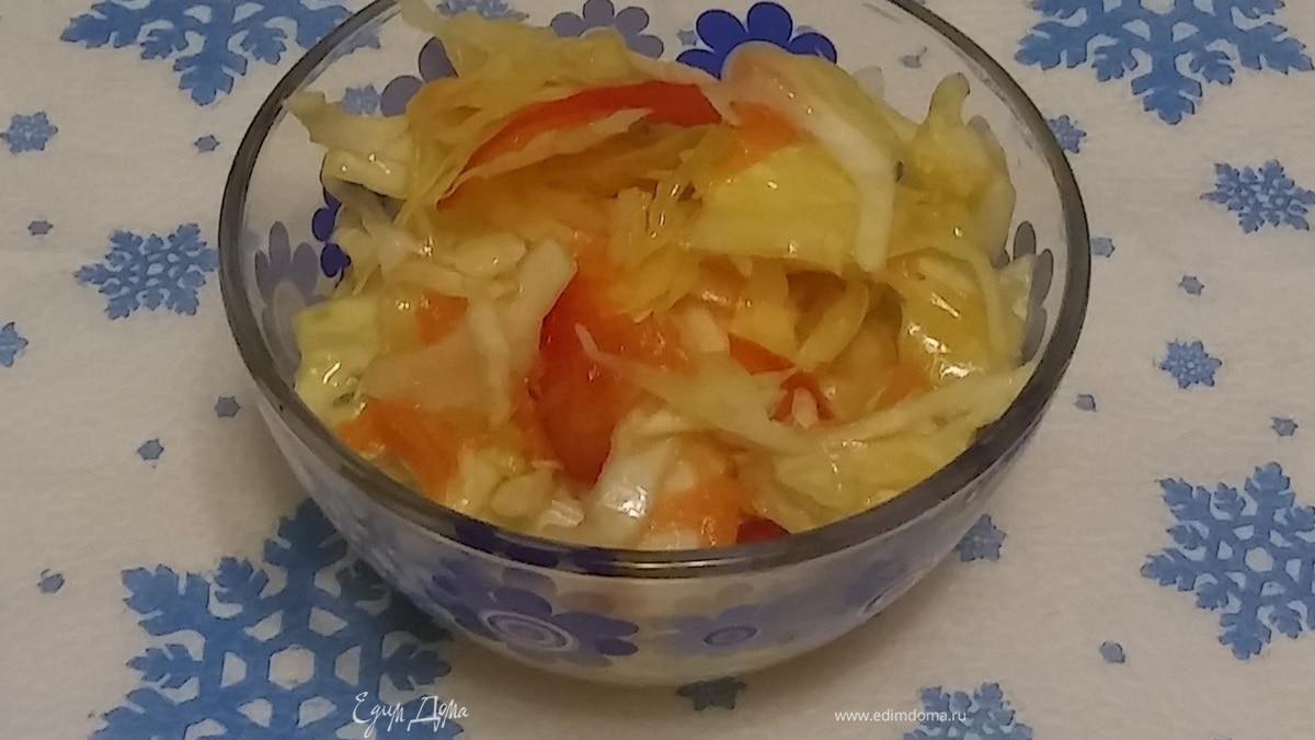 В кастрюлю, в которой будет мариноваться капуста, нужно положить все ингредиенты частями — часть моркови, капусты, болгарского перца, лука репчатого. Добавить к ним часть подсолнечного масла, уксуса, соли, сахарного песка и перца молотого. Все перемешать и продолжить наполнять кастрюлю дальше, пока все ингредиенты не закончатся. Затем накрыть тарелкой и установить гнет. Оставить в помещении при комнатной температуре на 2 дня. После чего можно наслаждаться капустой. Хранить в холодильнике. Приятного аппетита!