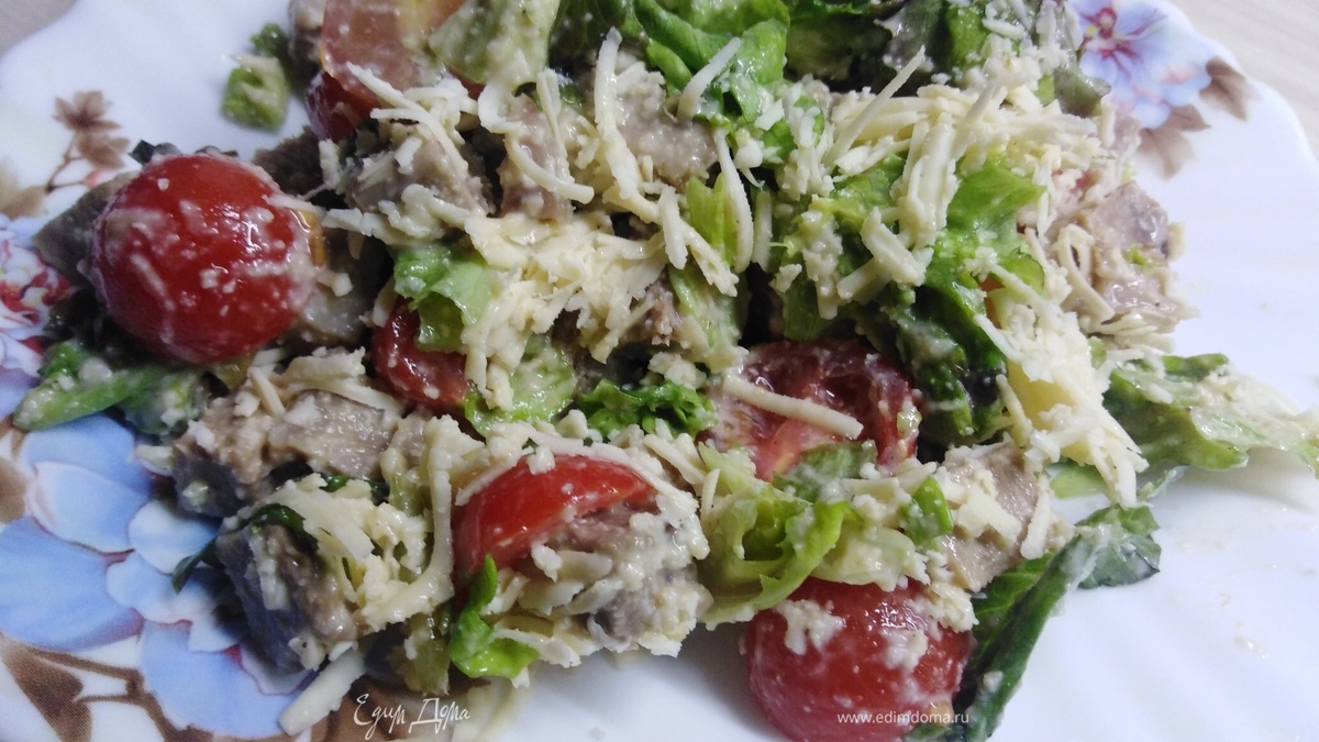 Листья салата порвать, добавить нарезанные кубиком языки. - Шаг 4