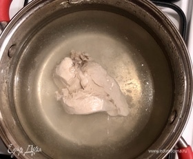 Отварить куриную грудку до готовности.