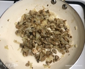 Добавляем к луку мелко нарезанные грибные ножки, обжариваем пару минут.