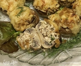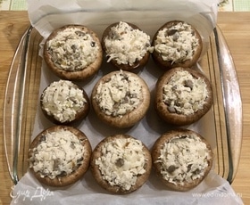 Выкладываем готовую начинку в грибные шапочки.