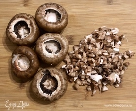 Шампиньоны промыть, отделить шляпки от ножек.