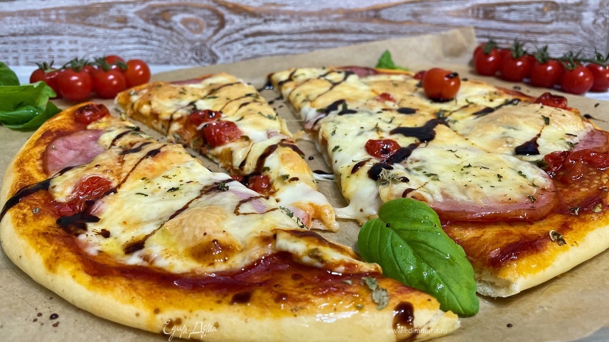 Горячую пиццу полейте бальзамическим соусом по желанию и подавайте к столу. Приятного аппетита!