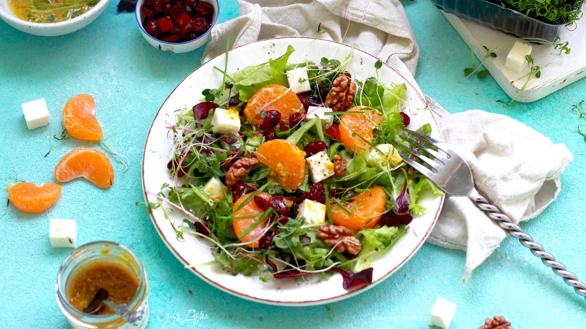 Легкий и яркий салат со сложным гармоничным вкусом — кисло-сладкая заправка, сладкие мандарин и клюква, соленая фета, горьковатые салатные травы и орехи.