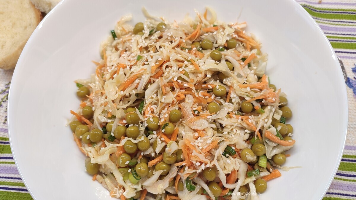 Капусту тонко нашинковать. Я это делала овощечисткой. Морковь натереть на терке для корейской моркови. Зеленый лук мелко нарезать, его добавляйте по вкусу. Всыпать зеленый горошек.