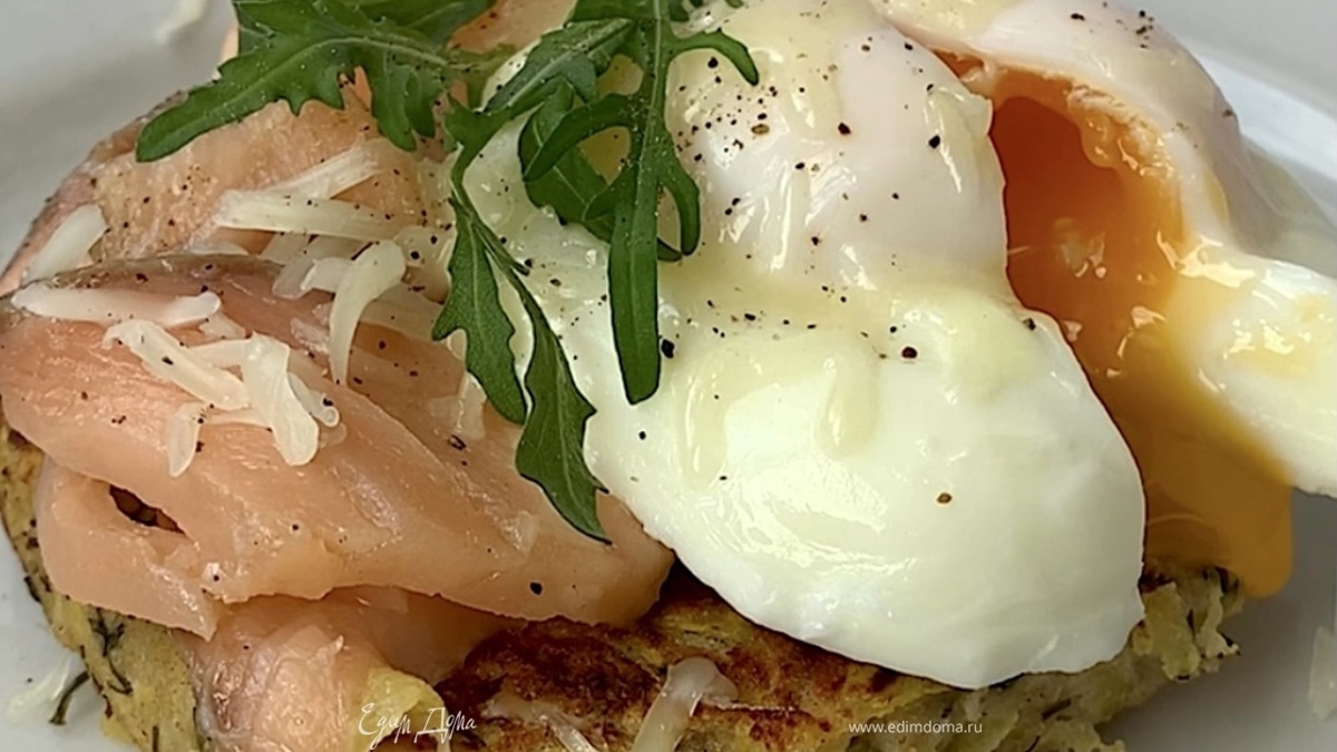 На готовую кабачковую котлету сверху выкладываем яйцо пашот. Подаем с соленой рыбой, руколой и сыром. Приятного аппетита!