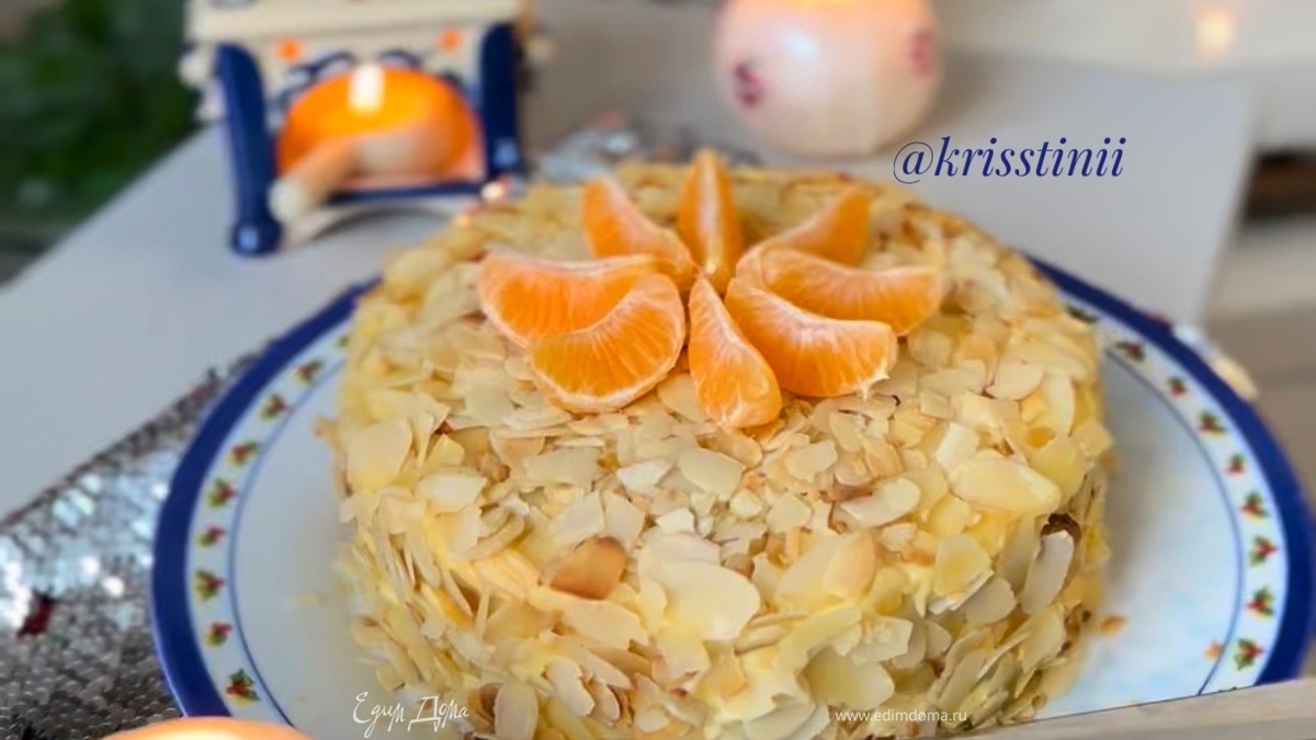 Лепестки миндаля слегка обжарить на сковороде и аккуратно обсыпать торт. Убрать в холодильник на пару часов для пропитки.