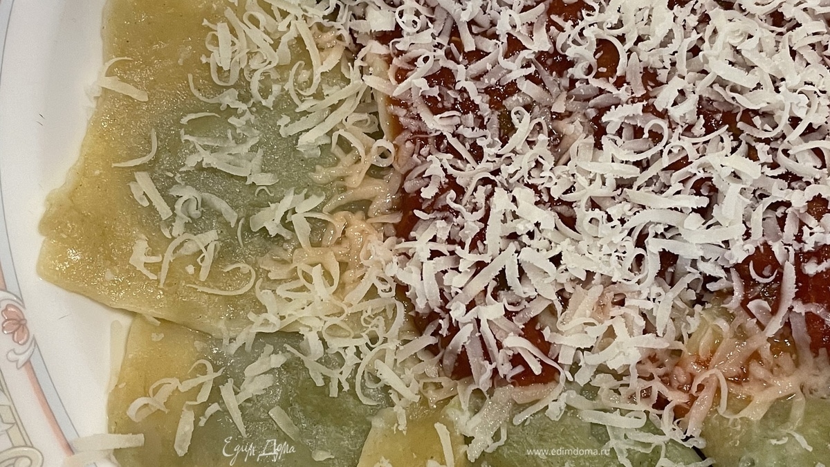Варить равиоли 3–5 минут. Подавать с томатным соусом и пармезаном. Приятного аппетита!