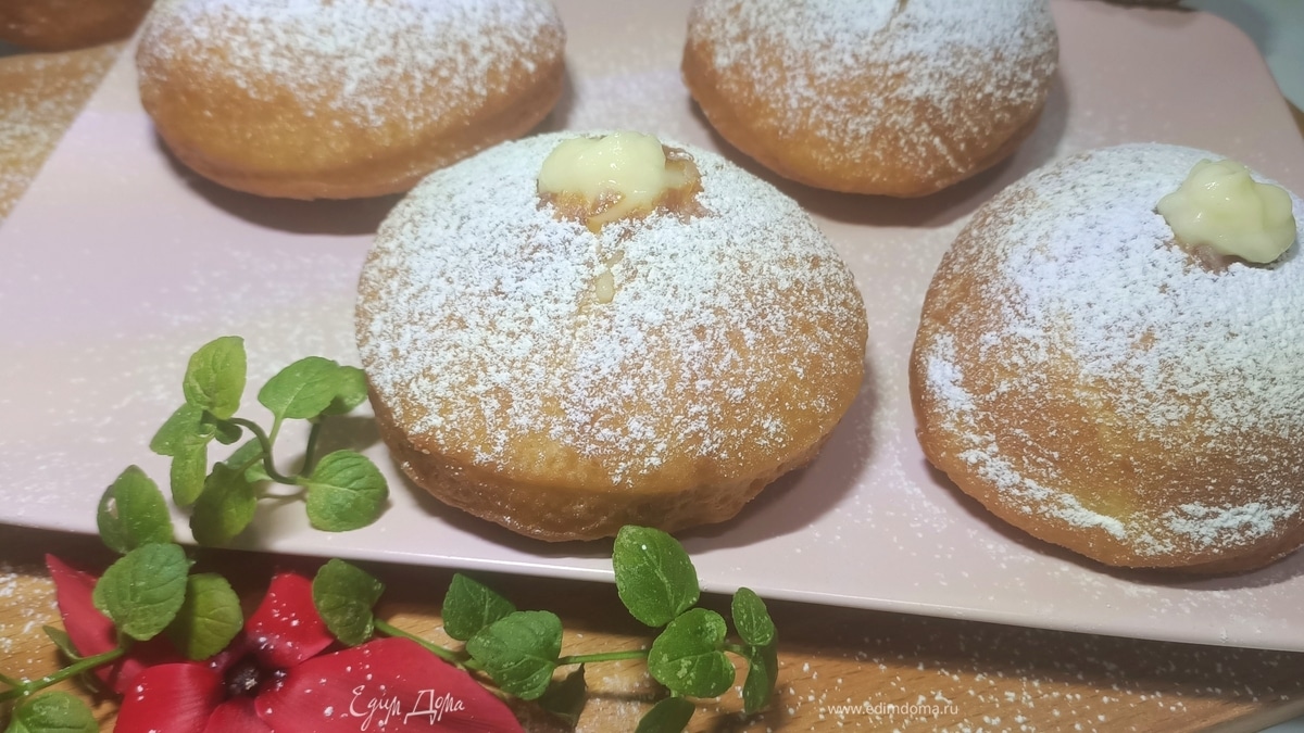 Выложить пончики на бумажное полотенце для удаления лишнего жира. Дать им немного остыть, а затем обвалять в сахаре или сахарной пудре. С помощью кондитерского мешка с острой концовкой наполнить выпечку заварным кремом. Приятного аппетита!