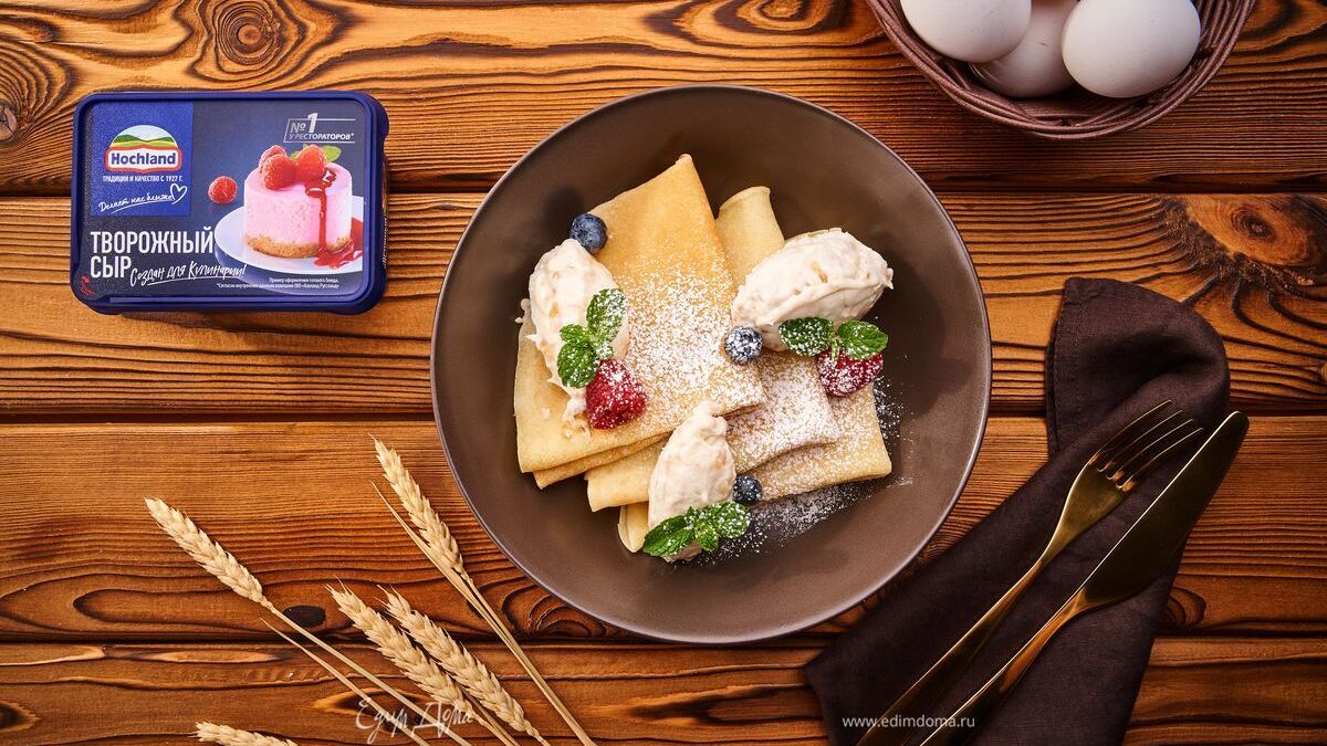 Готовые блины сложите треугольником, выложите банановый крем-чиз, украсьте ягодами, листочками мяты и посыпьте сверху сахарной пудрой.