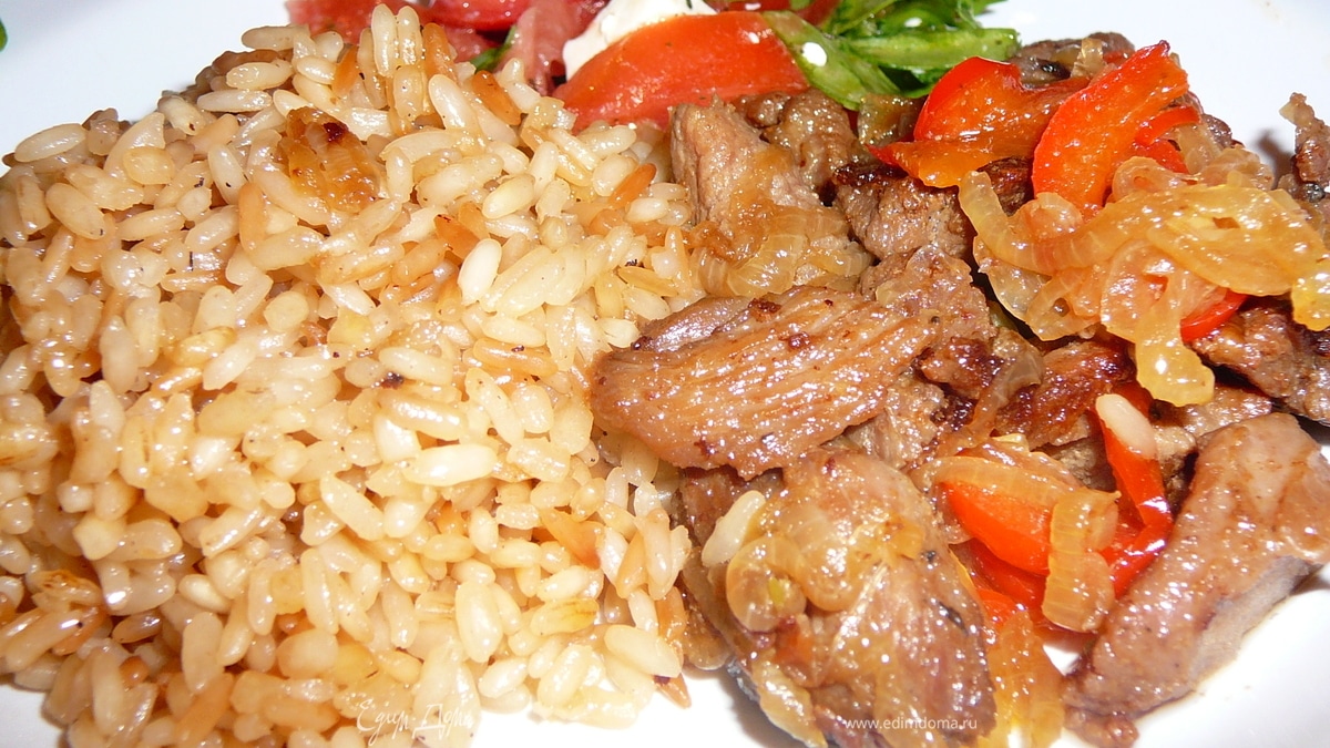В поджаренный рис аккуратно зальем кипяток, так чтоб закрыть его полностью. Накроем крышкой и готовим до полного впитывания жидкости. Это займет минут 20. Формируем наше блюдо и подаем с любым салатом из свежих овощей. Приятного аппетита! - Шаг 3