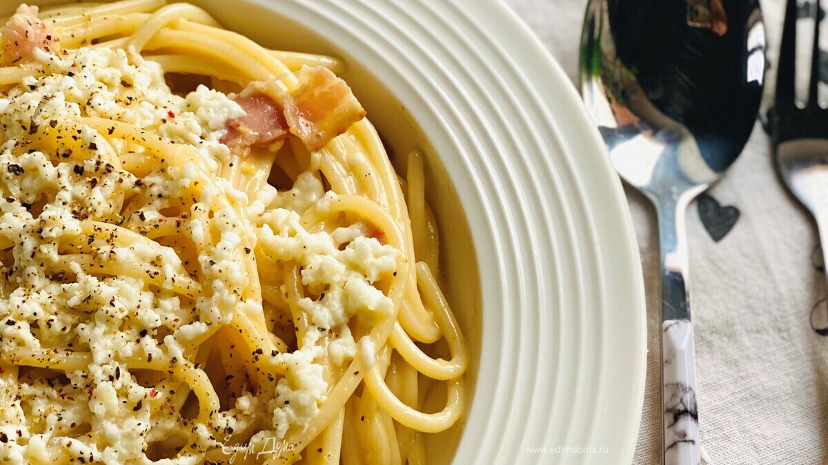 - Шаг 8Выложить спагетти на тарелку, сверху посыпать черным молотым перцем и тертым сыром.