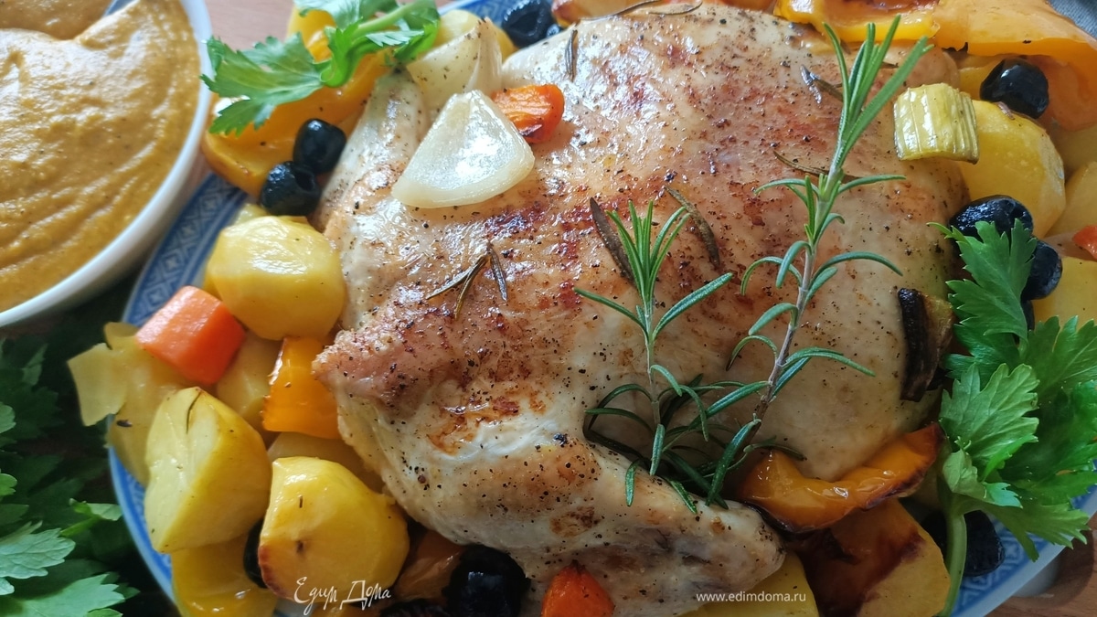 Нежная, сочная внутри и немного пикантная снаружи курица с овощами и овощным соусом. Порадует не только своим внешним видом, вкусом, но и простотой приготовления.