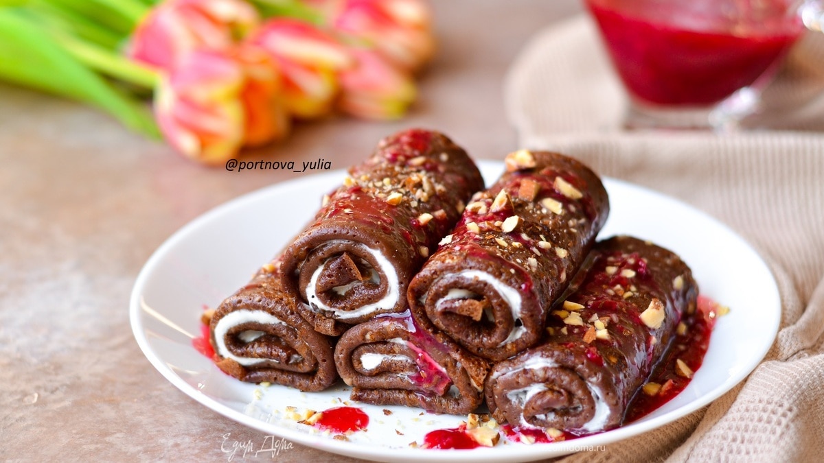 Молоко подогреваем примерно до 50°C, добавляем яйцо, сахар, тщательно размешиваем. Добавляем творог (если сильно крупный, пробейте блендером), муку, какао и ванилин. Вливаем кипяток и растительное масло. Оставляем минут на 10. Выпекаем блины на сильном огне с двух сторон до румяности. У меня получилось 10 блинчиков. - Шаг 2