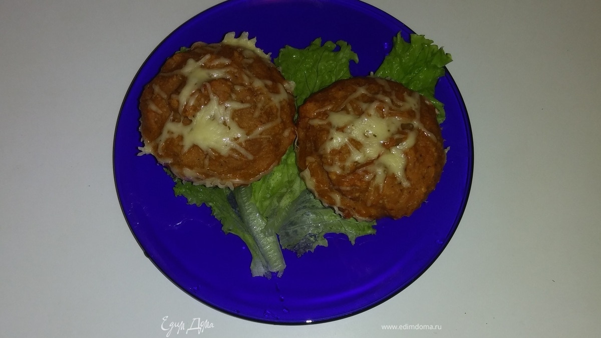 Смазать оливковым маслом формочки для выпечки и выложить в них тесто для маффинов (на 2/3 объема формочки). Затем разогреть духовку до 185°C и поставить в нее противень на 45 минут (время приготовления зависит от вашей духовки). За 5 минут до готовности посыпать маффины тертым сыром и запечь до готовности. Украсить тарелки листьями салата и выложить на них маффины. Приятного аппетита!