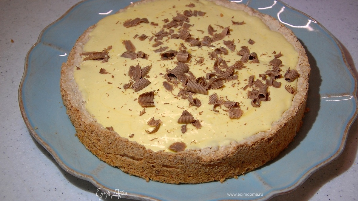 Шоколад тонко настругать и посыпать пирог.