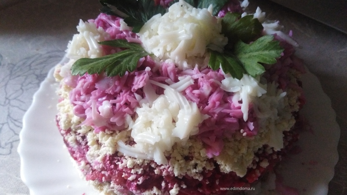 В тарелку первым слоем выложить рыбу с луком. Затем слой свеклы с морковью. - Шаг 4