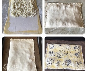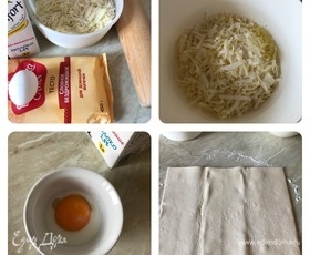 Духовку нагреть до 180°C. Сыр натереть на крупной терке, добавить яичный белок и хорошо перемешать. Стол слегка посыпать мукой и раскатать тесто в прямоугольник 40*30 см.