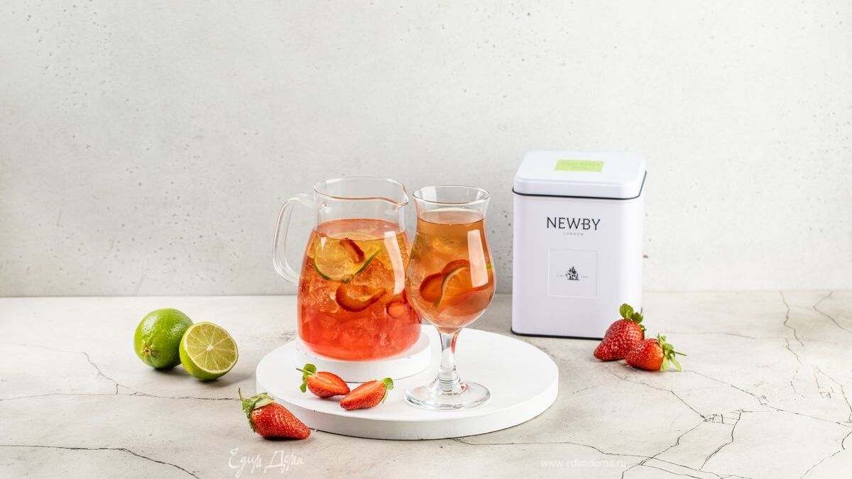 Выложите в кувшин лед, добавьте клубнику и лайм. Влейте клюквенный сок и сахарный сироп. - Шаг 5