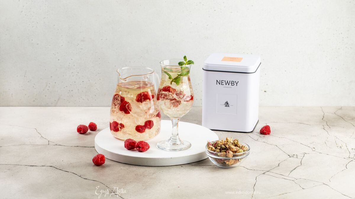 В кувшин положите лед, малину и добавьте сахарный сироп.