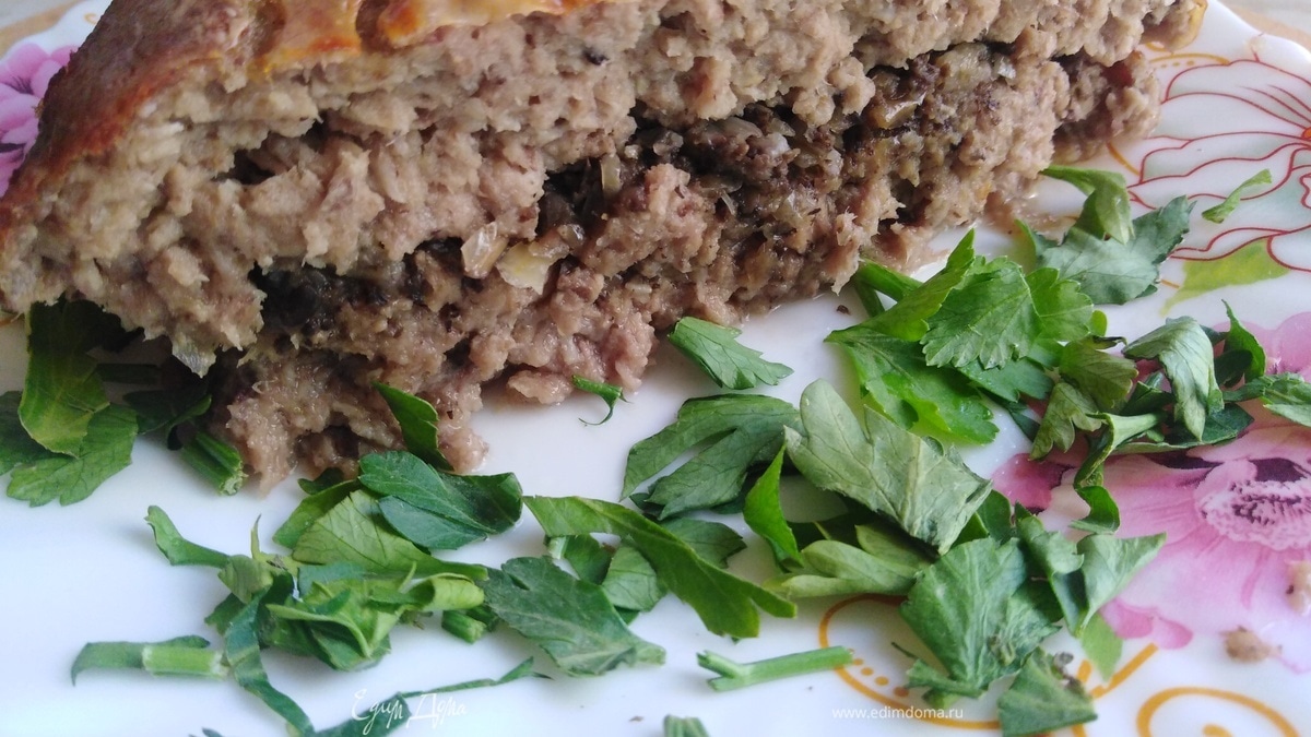 Форму для выпечки смазать растительным маслом. Выложить слоем половину фарша. Сверху — жареные грибы и оставшаяся половина фарша. - Шаг 5
