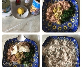 Из банки с тунцом слить жидкость. Переложить рыбу в тарелку, у меня тунец уже измельченный. Оливки и укроп нарезать. Добавить к рыбе сыр (у меня турецкий сыр «Лабне», но его можно заменить «Филадельфией»), зелень, оливки, перец, чесночный порошок, лимонный сок и аккуратно перемешать.