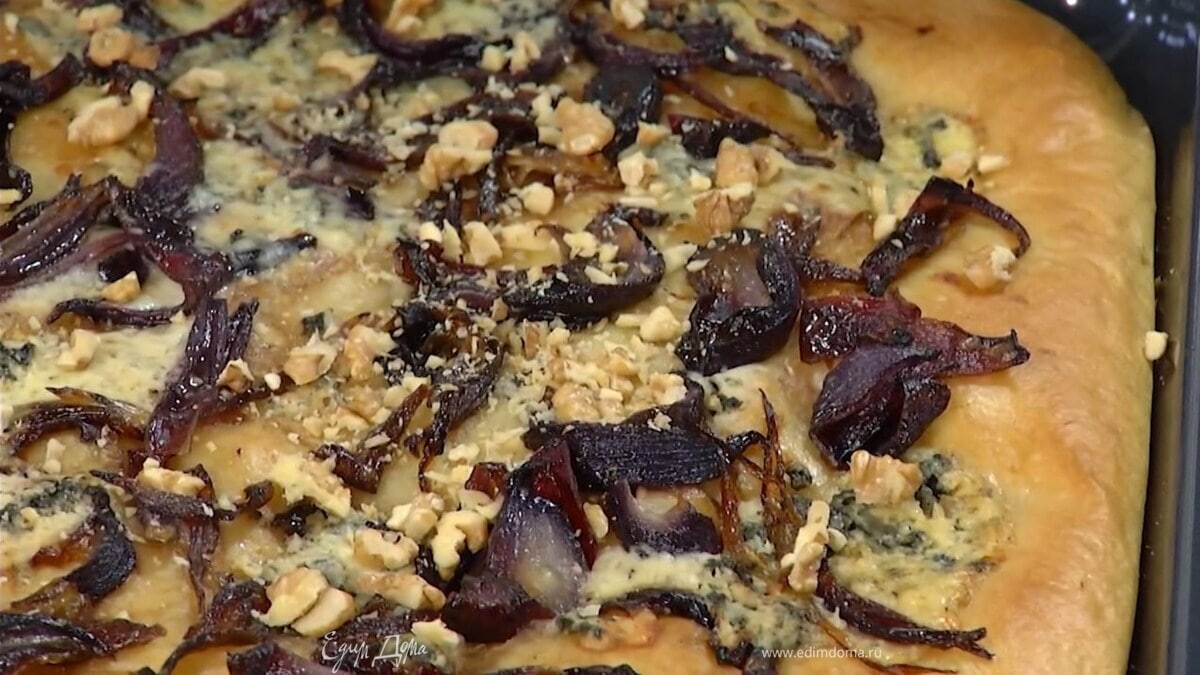 Фокачча с карамелизированным луком, голубым сыром и орехами