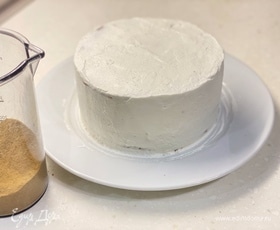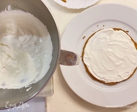 Соберем торт. На каждый корж намазываем 30 г крема. И так слой за слоем. Не забудьте намазать бока и верх торта.