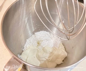 Приготовим крем. В чашу миксера поместить сметану и сахарную пудру. Взбивать до состояния жирного йогурта. Масса должна держать форму.
