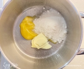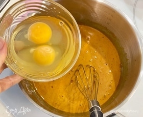 Когда масса перестанет расти в объеме, снять кастрюлю с плиты. Добавить яйца. Тщательно мешать массу венчиком, чтобы не дать яйцам свернуться.