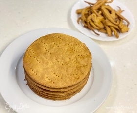 Остывшие коржи собрать в стопочку, а обрезки измельчить любым удобным способом в крошку.