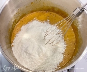 Дать массе 5 минут остыть и затем понемногу добавить муку. Хорошо вымешивать тесто до однородности.