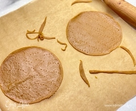 Теперь нужно раскатать заготовки, толщиной 2 мм. И вырезать из них круги диаметром 16 см (обрезки также выпечь). Удобнее раскатывать и вырезать тесто сразу на пергаменте. Проколоть корж вилкой и выпекать при 170°C около 6 минут. До румяности. Готовые коржи сразу снять с пергамента и дать остыть на ровной поверхности.