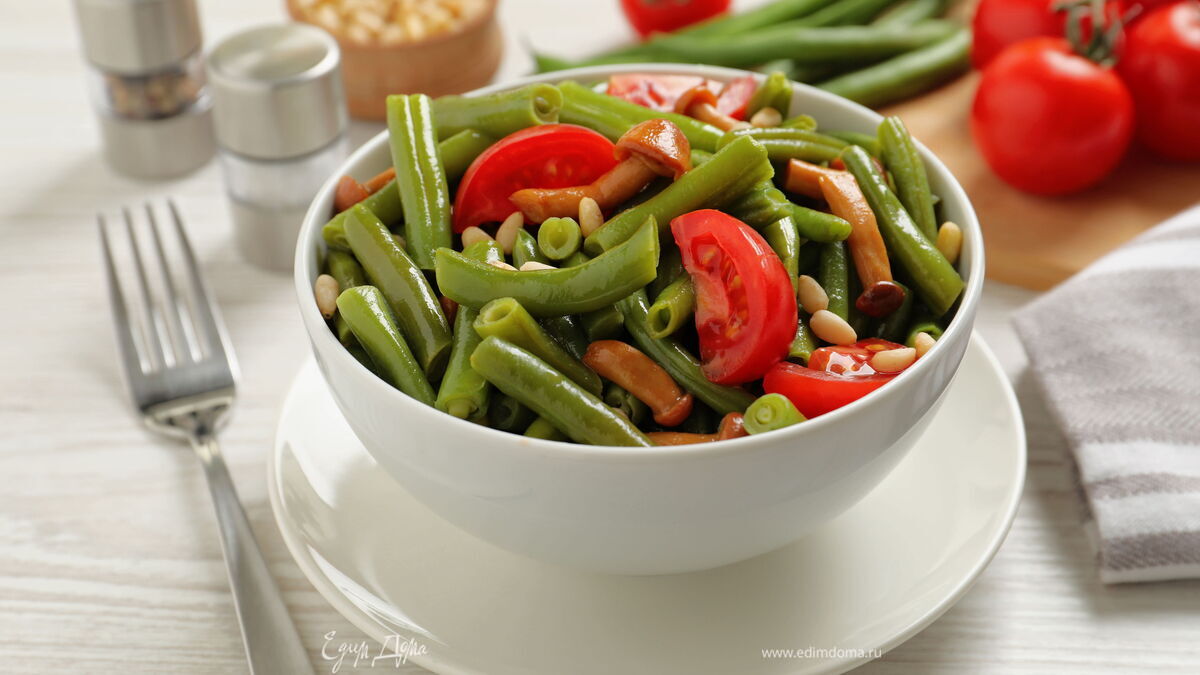 Простой салат с зеленой стручковой фасолью и консервированными грибами можно подать к постному обеду или ужину. Фасоль