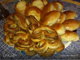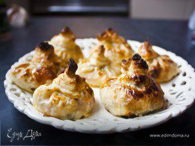 - Шаг 7На половинку круга выкладываем начинку, слегка растягивая сверху, закрываем второй половинкой круга. Выкладываем на противень, смазываем яичным желтком и выпекаем при 180°C около 20 минут.