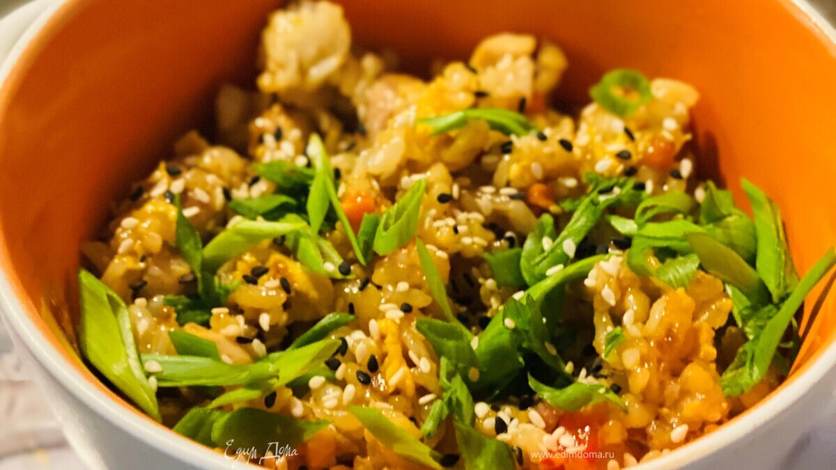 - Шаг 5Смешать ингредиенты для заправки, залить рис с начинкой, перемешать. По желанию посыпать зеленым луком и кунжутом.