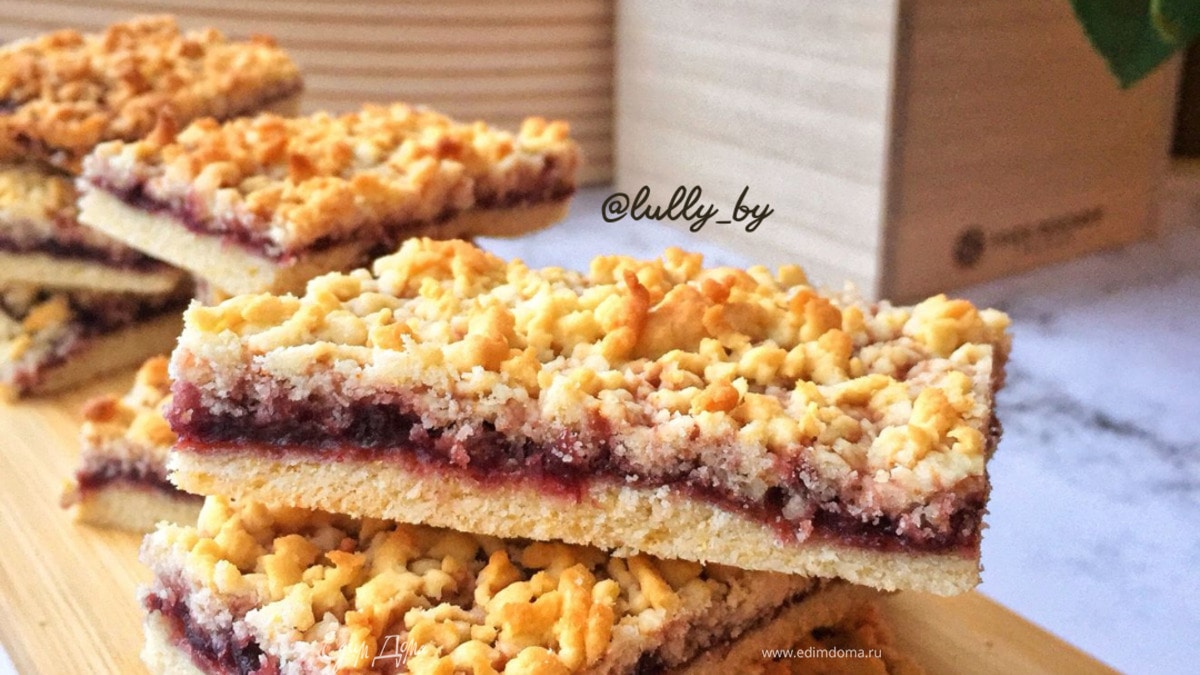 - Шаг 6Первую часть теста натираем на крупной терке поверх варенья.