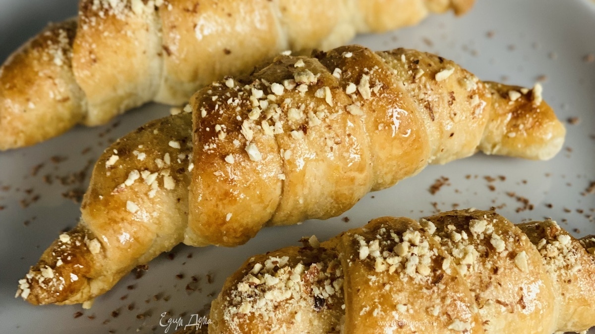 - Шаг 7Готовые круассаны смазать сиропом с помощью кисточки, посыпать измельченными орехами и тертым шоколадом.