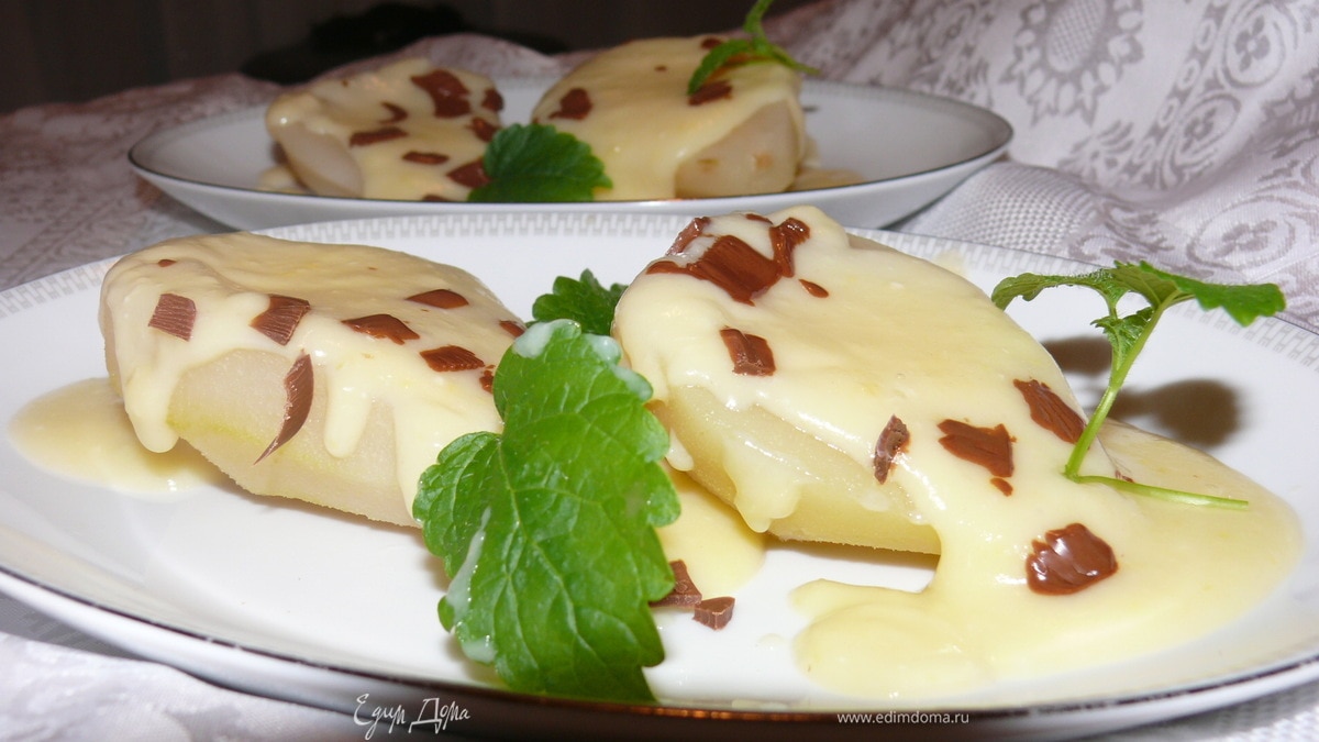 Груши выложить на сервировочную тарелку, полить горячим соусом, украсить шоколадной стружкой и листиками мяты. - Шаг 2