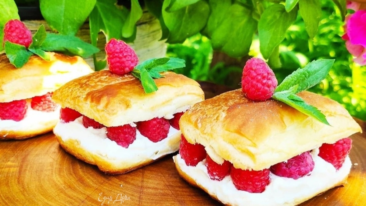 - Шаг 4Готовые пирожные остужаем, разрезаем пополам, мажем обильно кремом и малину туда отправляем. Собираем пирожные, украшаем малиной и мятой.