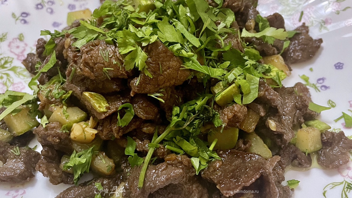 Как только кабачки перестанут жестко хрустеть, но и не распадутся-расползутся в инертную массу, выложил их в салатницу к мясу. Аккуратно перемешал, добавил мелко нарубленную зелень. Очень хорошо бы еще добавить кунжутное семя. Но не случилось его в закромах. - Шаг 12