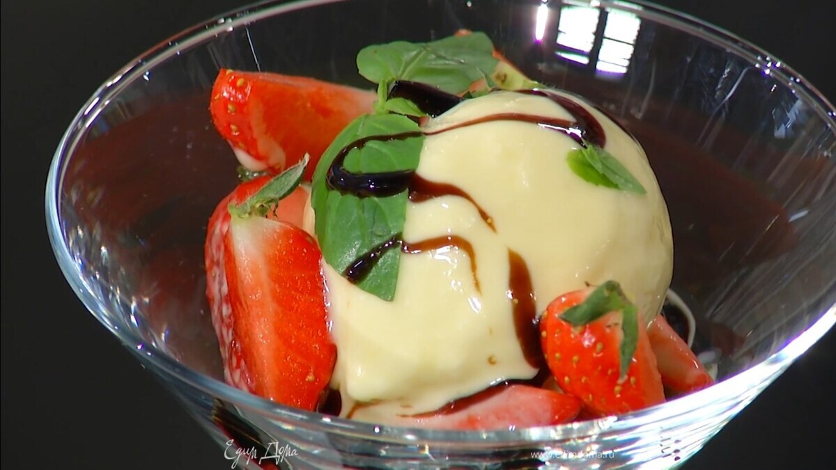 В прозрачные бокалы разложить часть клубники и мороженое, украсить все оставшейся клубникой, полить бальзамиком.