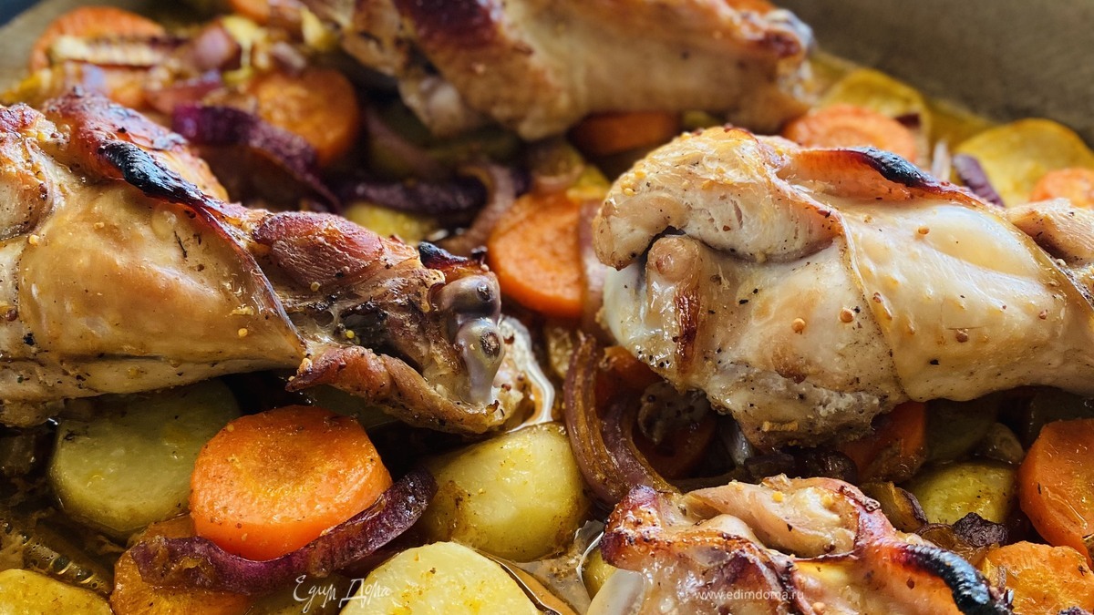 - Шаг 3Противень застелить бумагой для выпечки, выложить слой картошки, затем морковь и лук. Сверху индейку.