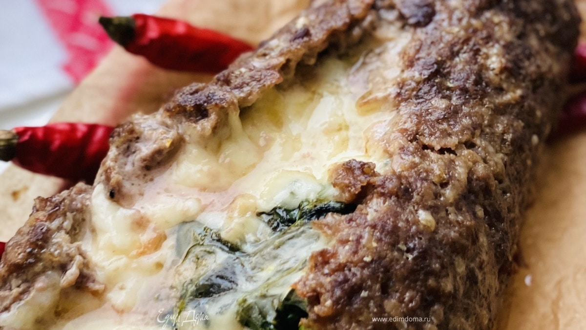 - Шаг 3При помощи двух пергаментов раскатать фарш в ровный пласт. Выложить ломтики сулугуни и сверху шпинат. Скрутить рулет, раскрыть посередине и придать форму лодочки.