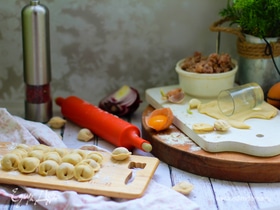 - Шаг 3Тесто раскатать колбаской и нарезать на 10 частей. Каждую часть раскатать лепешкой радиусом 10 см, в центр выложить 1 ст. л. начинки и защипать края.